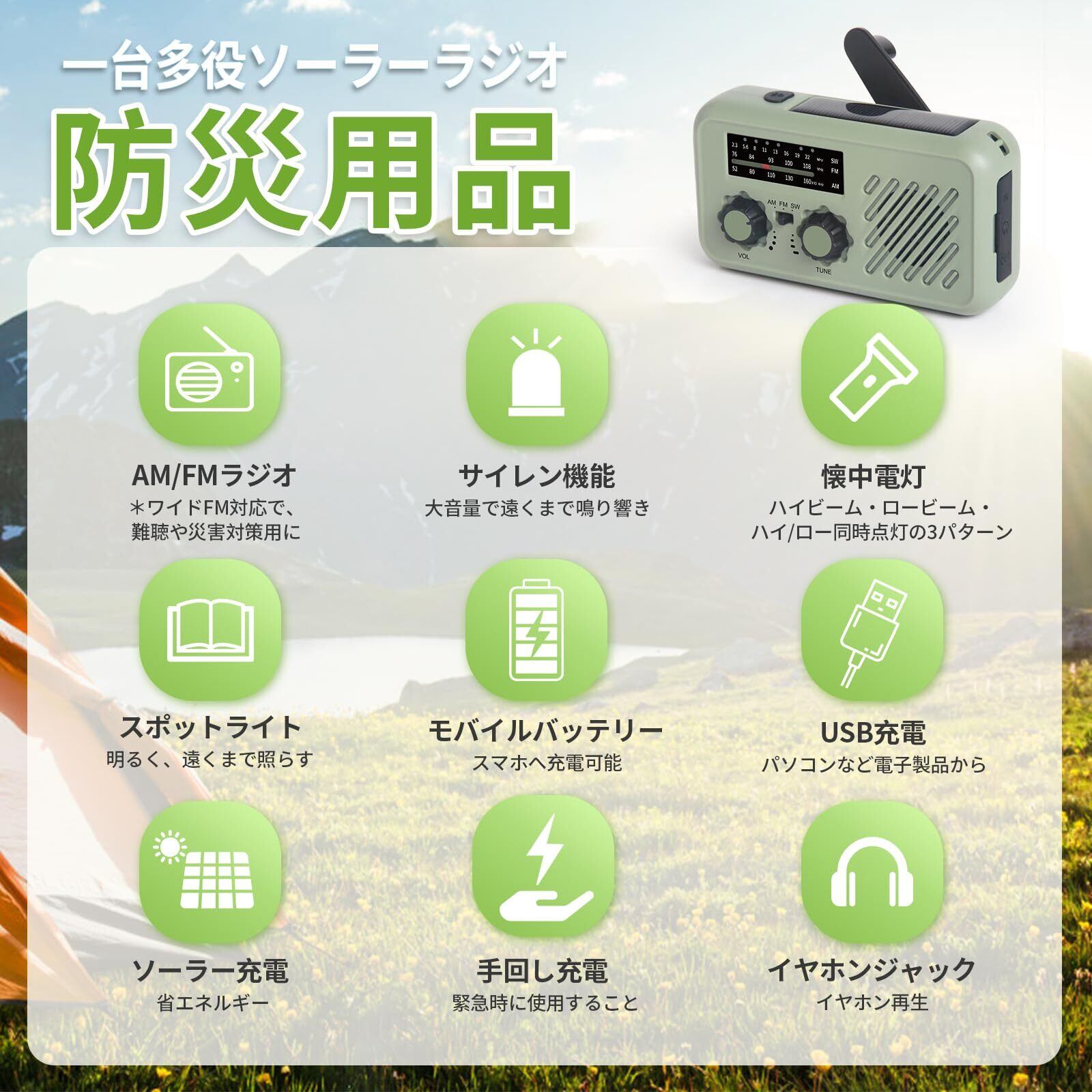 携帯ラジオ 小型 イヤホンジャック付き型 ソーラーラジオ AM/FM SOS 懐中電灯 スポットライト USB充電 スマホ充電 手回し 地震 津波 台風などの緊急対策 アウトドア 防災グッズ 非常用照明器具 ライトグリーン