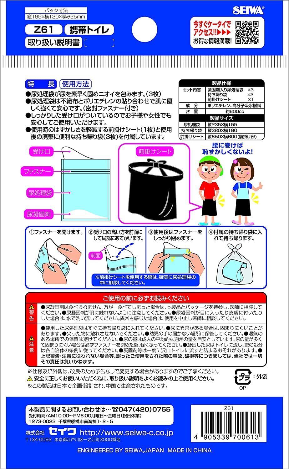 オシッコを素早く固め臭いを包む、持ち帰り袋と前掛けシートを付属した携帯トイレ(Z61)の3枚入り5個セット。