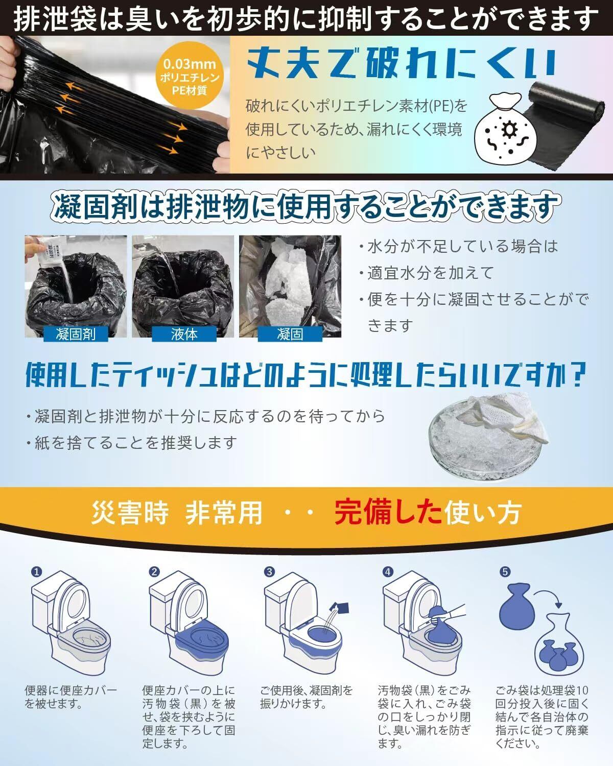 【トイレ凝固剤×高吸水性樹脂|3ステップ直感的操作】 ①便器に袋設置 ②凝固剤を均等散布 ③固化後に密封廃棄。環境配慮型素材|廃棄時も土中分解可能。