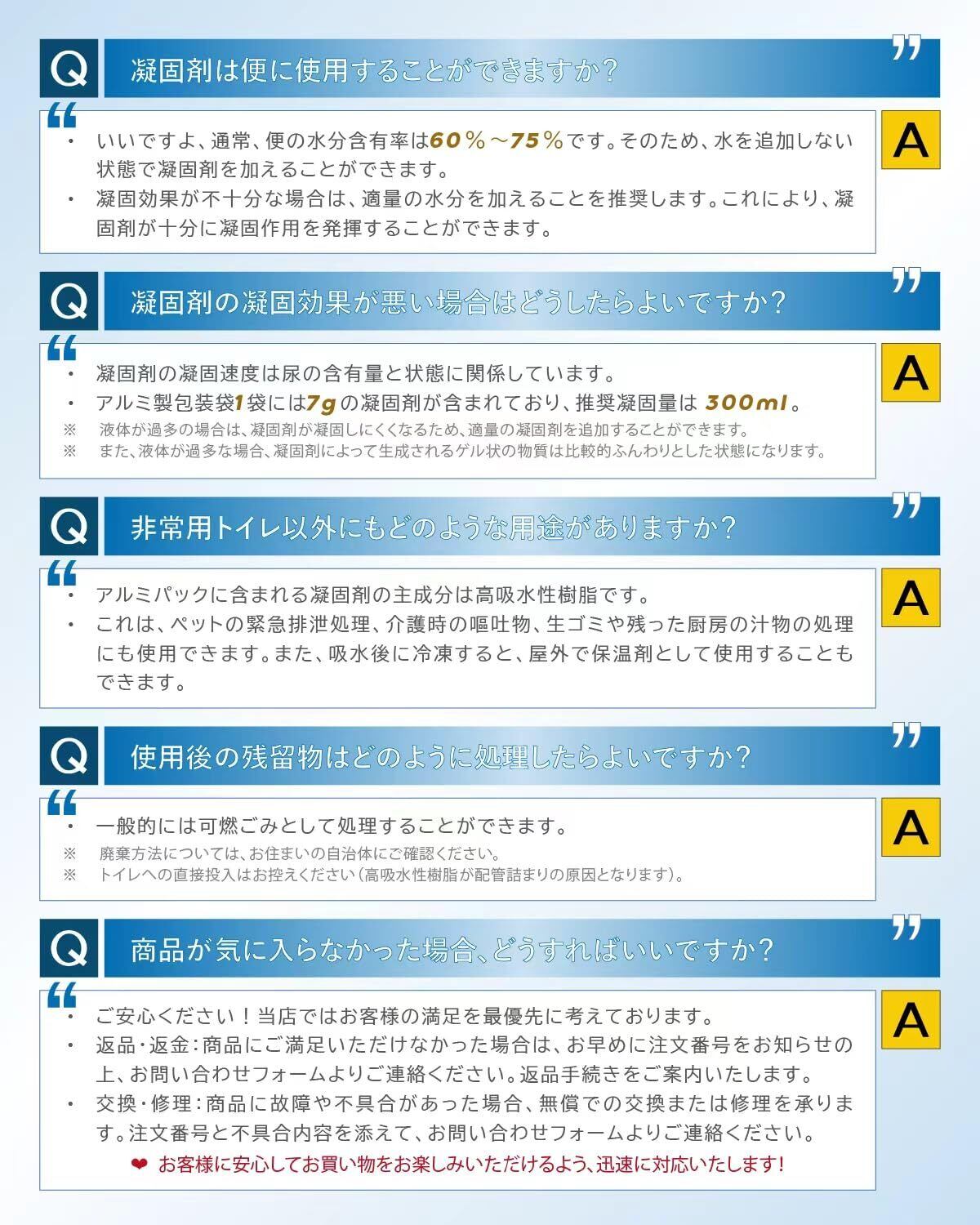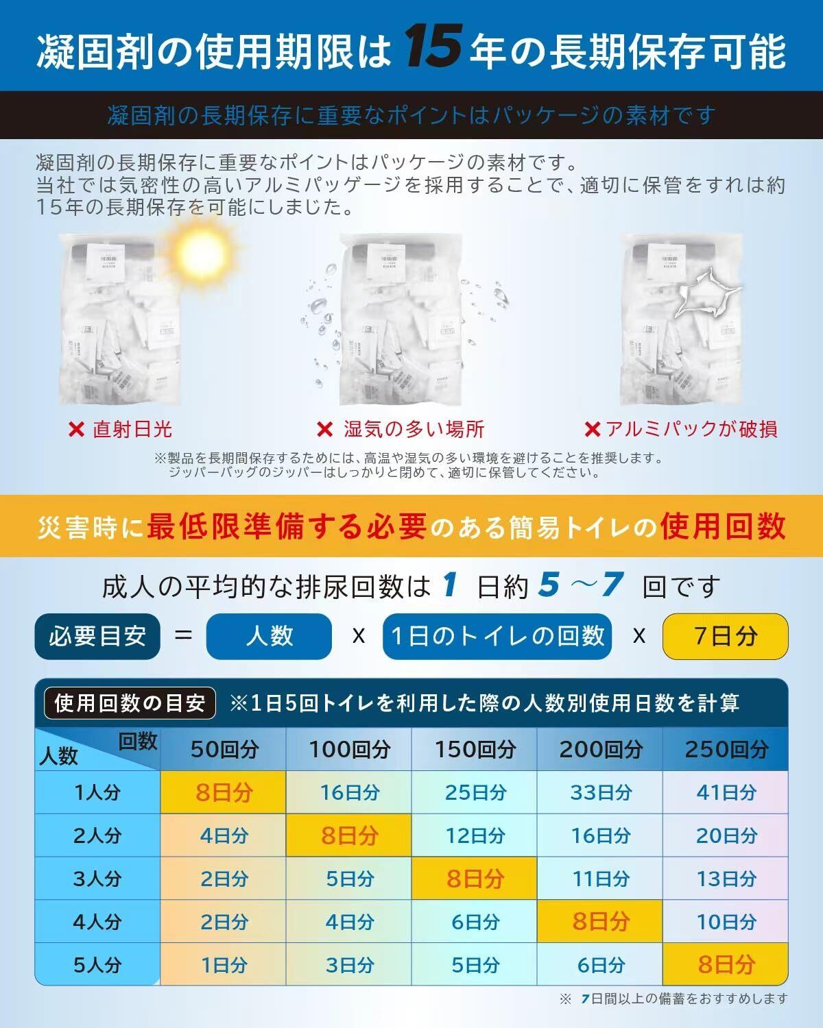 【トイレ 凝固剤 100回分×凝固剤 粉末|長期保存の実用設計】 アルミ遮光包装|直射日光下でも15年間成分安定。軽量小型設計(1包7g)|収納スペースを圧迫しない。水不要で即使用可能|断水時/車中泊/渋滞時の緊急対応。