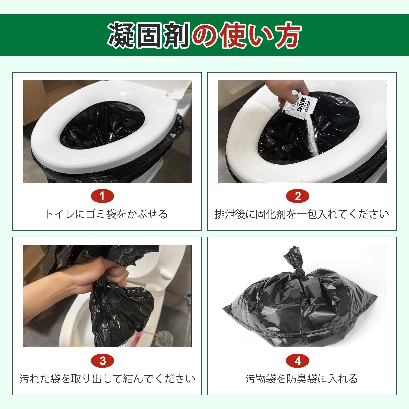 【トイレ凝固剤×高吸水性樹脂 | 簡単操作、便利さ抜群】①便器に袋をセット ②凝固剤を均等に撒布 ③固化後、封をして廃棄。環境に優しい素材を使用しており、廃棄時には土中で分解され、環境汚染を防ぎます。