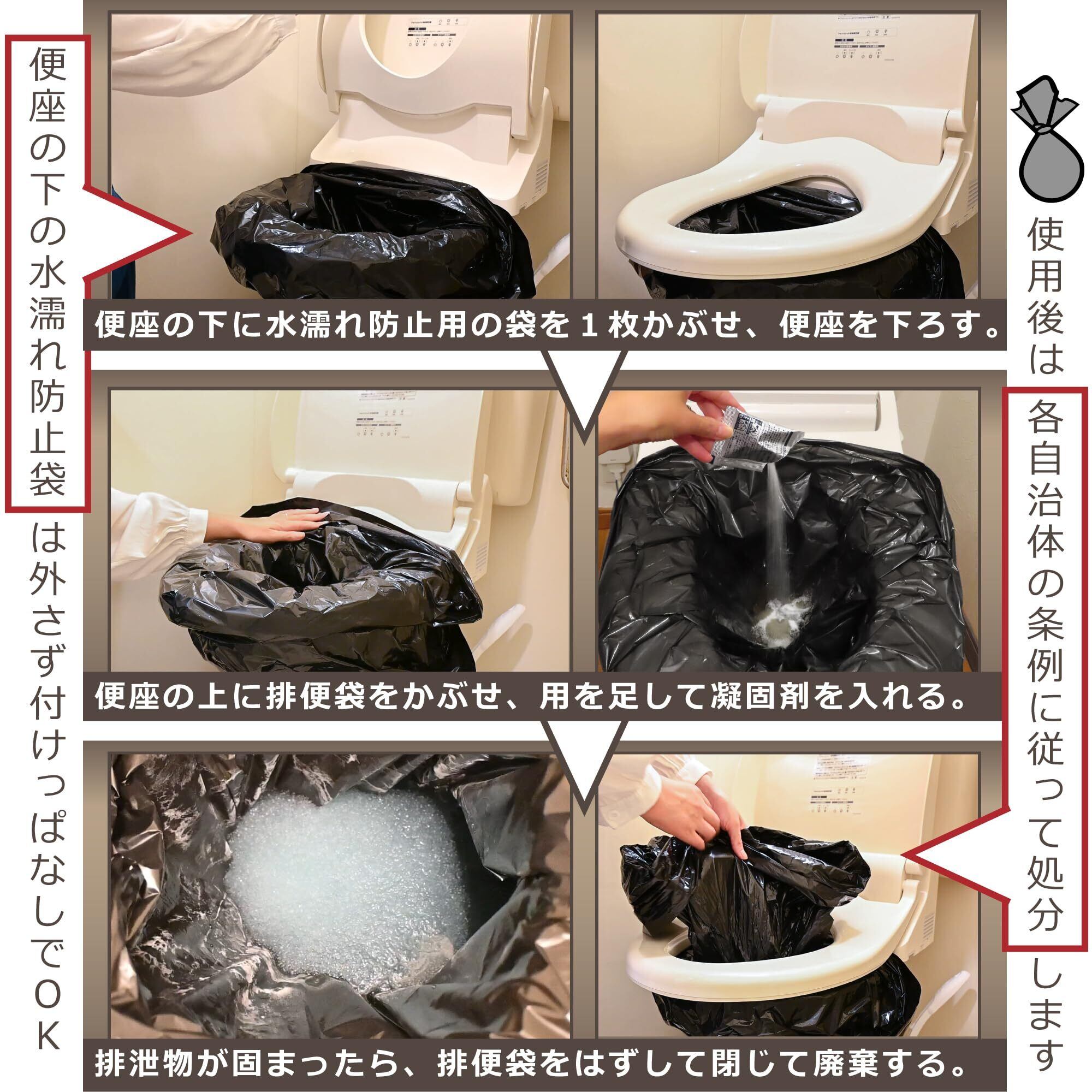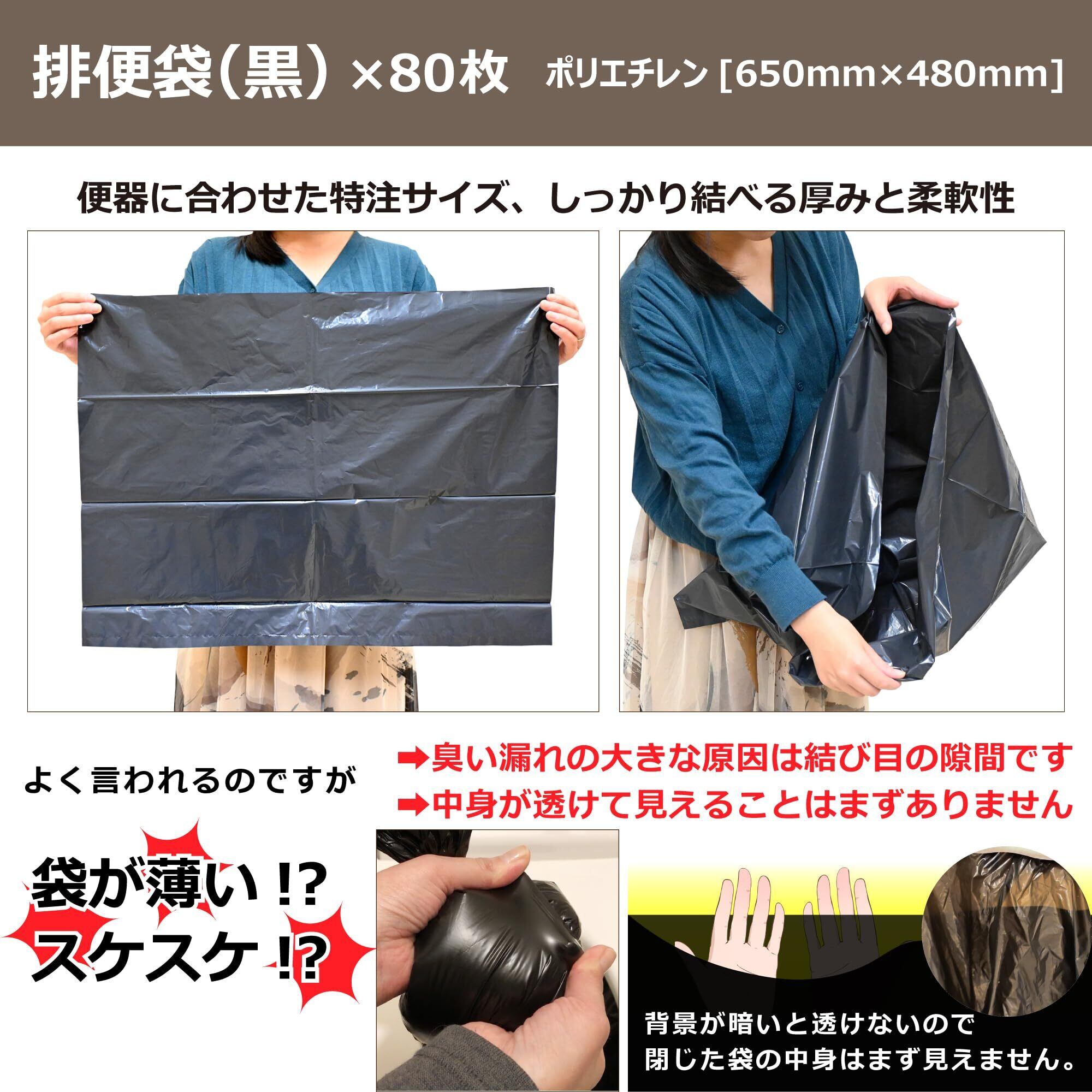 【 排便袋 】 [ 袋サイズ ]:650mm×480mm(一般的な家庭用トイレの便器にフィットするサイズ) / 黒色のポリエチレン製で中身が透けにくく、しっかり結べる厚みがあります。袋を便器にかぶせて使う方式のため、初めての方やお子様、高齢者でも直感的に使いやすい仕様です。