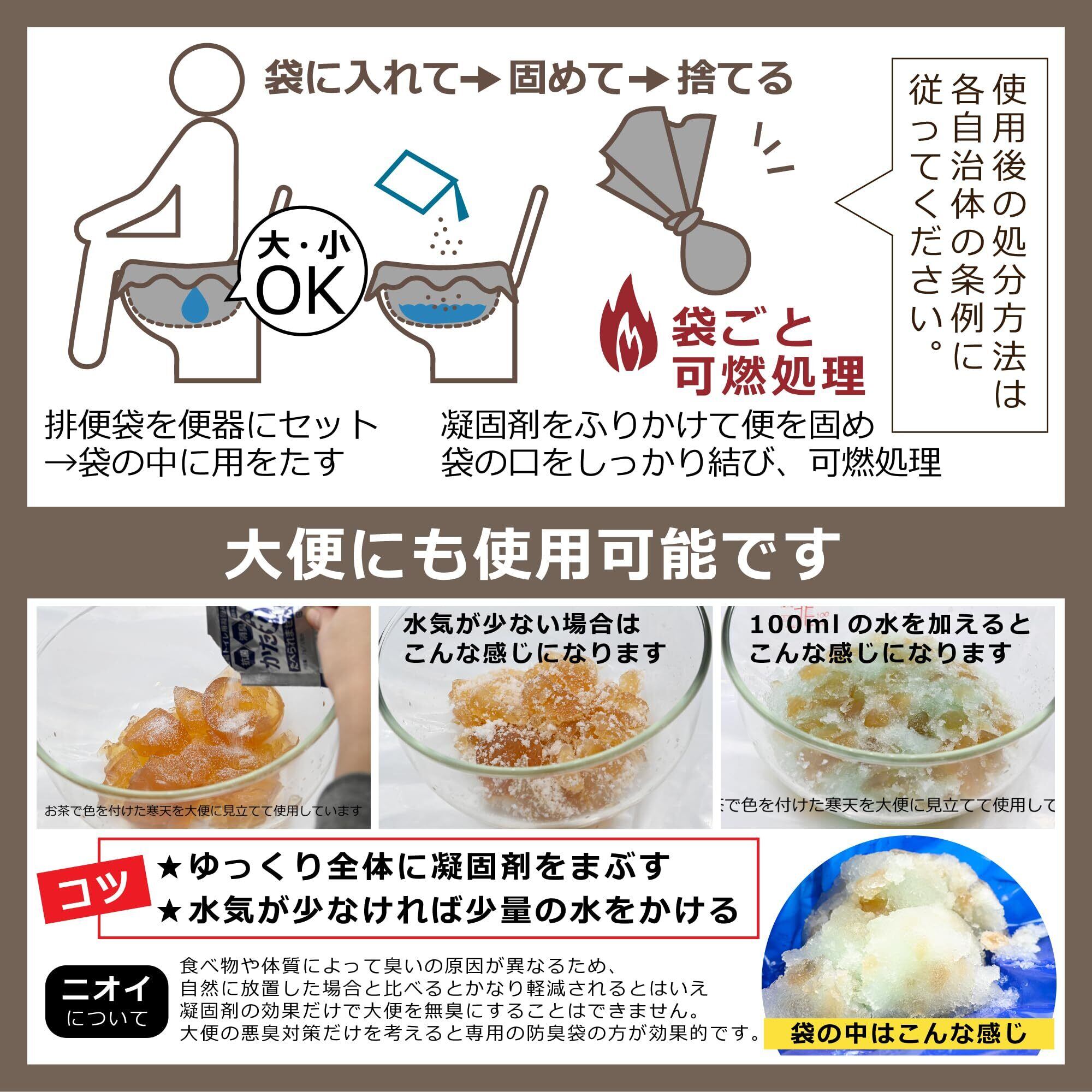 【 凝固剤 】 1回分ずつアルミパウチで密封された防湿・防水仕様の日本製凝固剤です。 高吸水性ポリマーを主成分とし、排泄物の水分を素早くゼリー状に固めます。 アンモニアやメチルメルカプタンなど、主要な4大悪臭成分に対する消臭性能と、代表的な菌種に対する除菌性能を備えています。 ただし、人間の排泄物は体調や食事によって変化する複合臭であり、完全な無臭にはできません。 当製品は、凝固作用をしっかり維持しながらも、可能な限りの消臭・抗菌効果を両立させた設計となっています。 凝固スピードだけを数秒早めるよりも、「しっかり固まり、衛生リスクを抑える」ことを最優先に設計しております。 災害時の衛生環境を守るため、長時間の使用後でも効果が続くよう調整しています。 ※粉末タイプのため使用時に舞うことがあります。袋を開く際や投入時に顔を近づけすぎないようご注意ください。