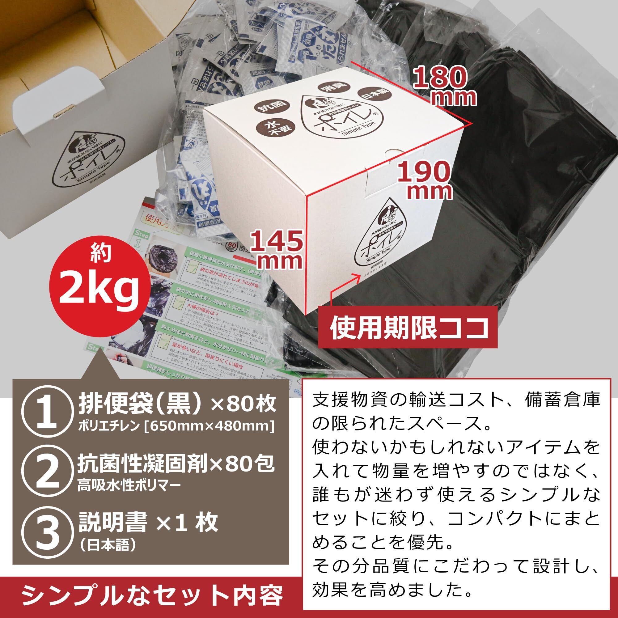 【 非常用トイレセット80回分|15年保存|日本製 】2人で約5〜7日分、3人で約4〜5日分の使用を想定しています。 [ セット内容 ] 抗菌性凝固剤 80包 / 排便袋 80枚 / 説明書 [ 箱の外寸 ]:190×180×145mm [ 重量 ]:約2kg 家庭や職場などで保管しやすいコンパクトサイズ。 誰でも迷わず使えるよう、排便袋と凝固剤のみのシンプル設計です。 <シンプル&コンパクト> 万一の災害時に、支援物資の運搬コストや備蓄スペースを圧迫しないよう、「使うかどうかわからない付属品を増やして物量を膨らませる」のではなく、“本当に必要なものだけ”を厳選し、可能な限り詰め込んだキューブ型の箱にまとめました。 倉庫や備蓄棚など限られたスペースでも効率よく保管できるため、行政・企業・団体での備蓄にも適しています。※パッケージ前面には「製造年月」ではなく「使用期限」を明記しており、防災グッズとして定期点検や入れ替えがしやすい設計です。