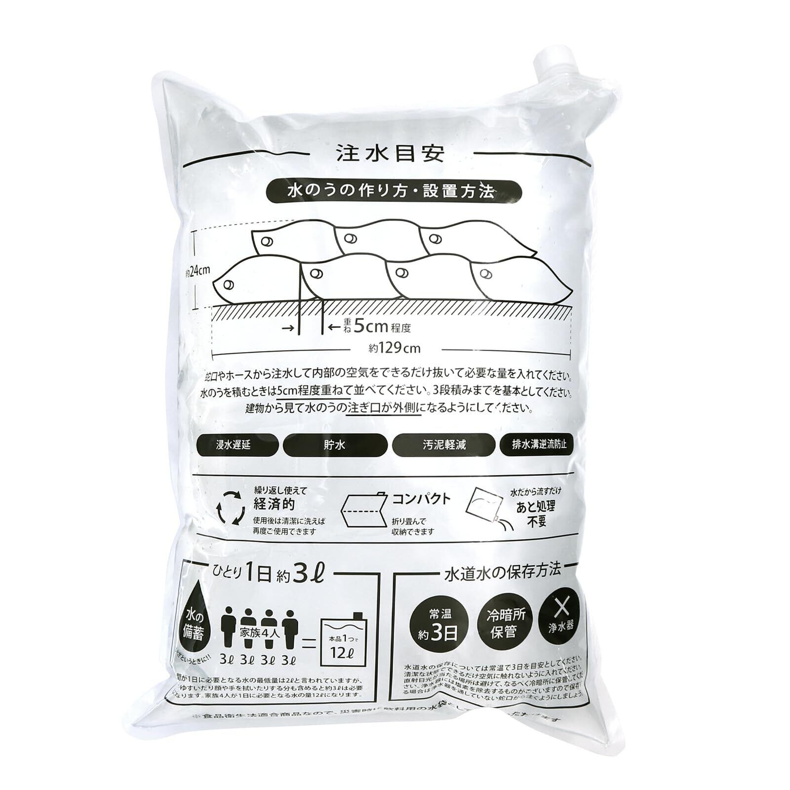1パック7枚のセットで幅約129cm、高さ約24cmの浸水遅延の壁を作ることができます。