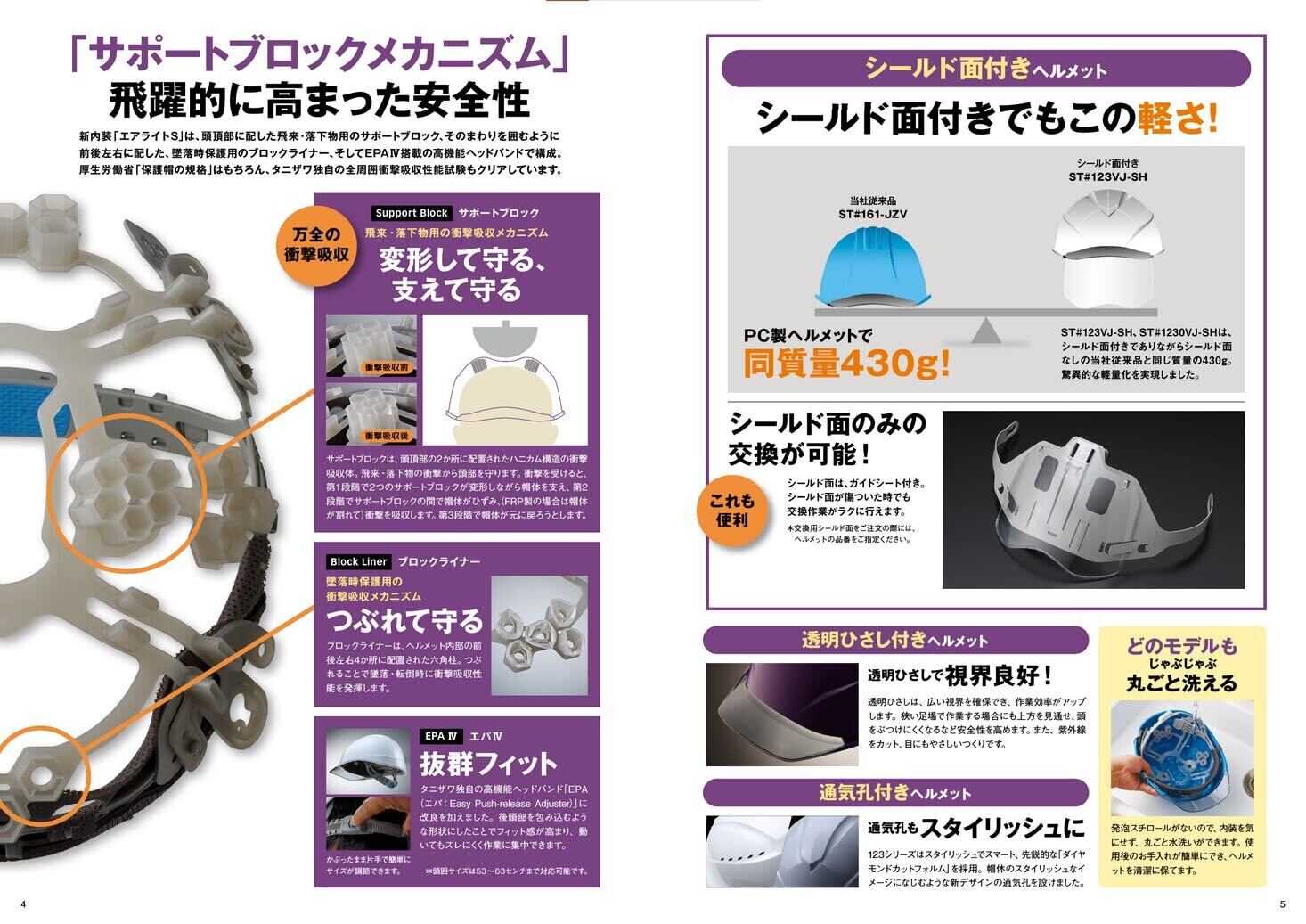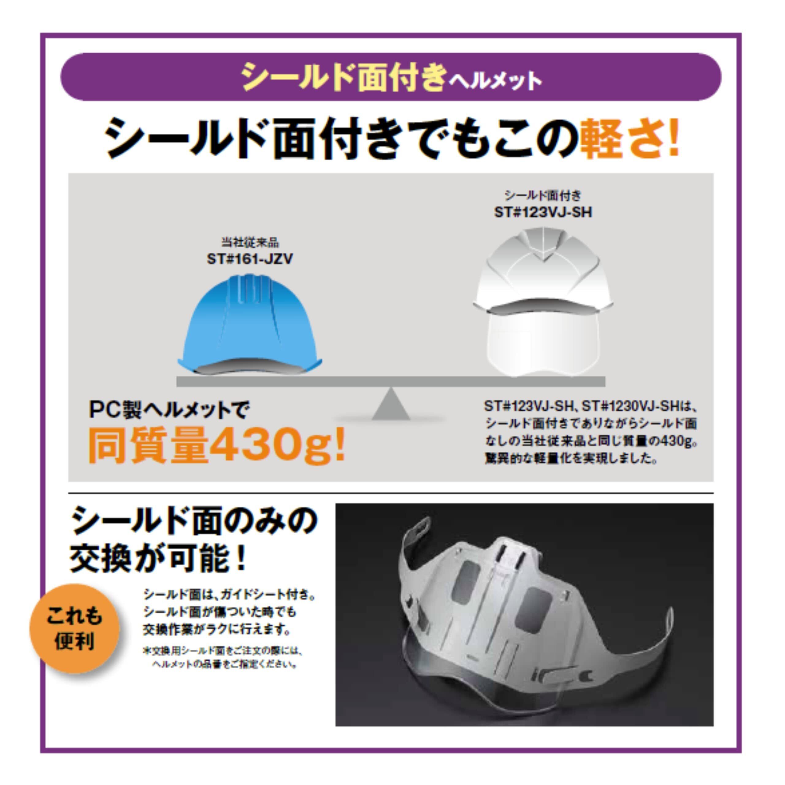 前ひさし型・シールド面付型式では430gと抜群に軽量で、首への負担を軽減します。帽体の高さが13.3cmとコンパクトな作りになっており、足場に頭をぶつけにくいです。ヘルメット内部をスムーズに喚起し、温度と湿度の上昇を防ぎ、従来品より更に涼しいです。雨だれを防ぐ溝付タイプです。高機能ヘッドバンドを標準装備しており、フィット感が高くズレにくいです。