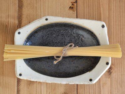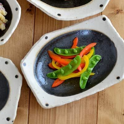 ざっくりとした造りながら温かく表情があり、味わい深い雰囲気。 盛り付け部分の黒が食材の色を引き立て、なお食卓も引き締めます。