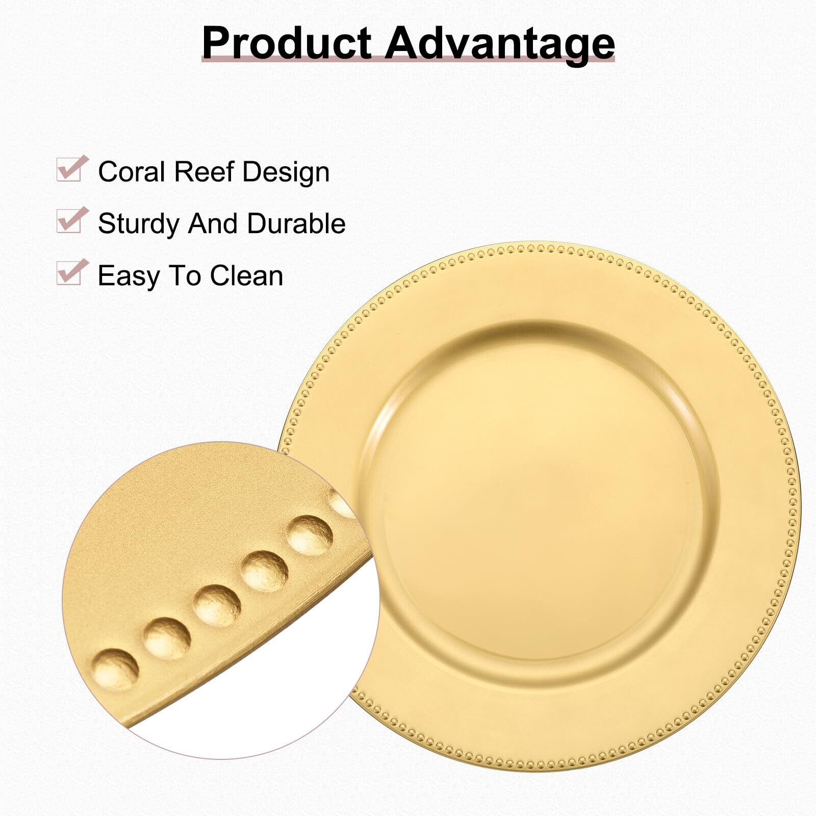 素材 - これらのラウンドプレートチャー ジャーは、プラスチック製で細工が施された質感のある表面を持ち、軽量で丈夫、ふかいなにおいはなく、洗えて再利用可能で、割れたり色あせたりしません。スタイリッシュなデザインは他の人の注意をすぐに引きます。