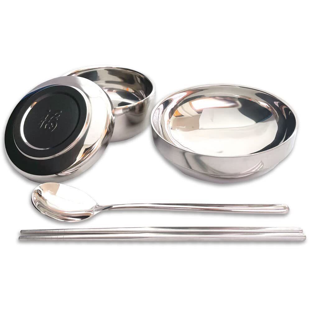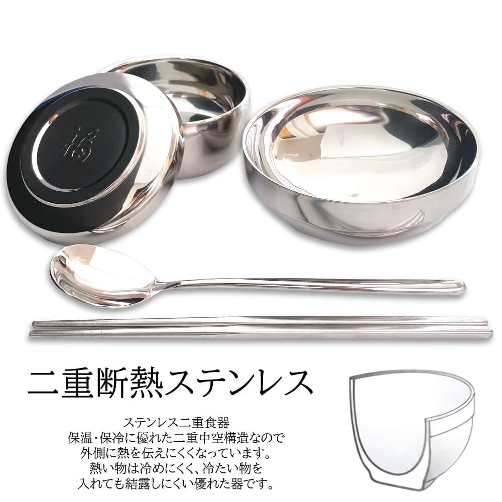 韓国式 茶碗 プレミアム 5点セット [茶碗, 蓋(福印), 箸, スプーン, 汁椀] ステンレス二重食器 保温・保冷 二重中空構造