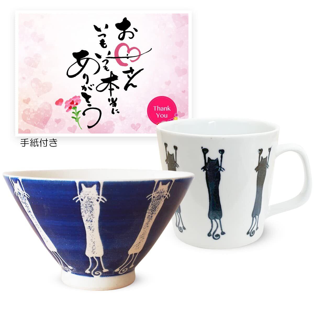 勲山窯 母の日 プレゼント 茶碗 11.5cm マグカップ 270ml セット 波佐見焼 日本製 J-kitchens 背伸び ねこ ブルー