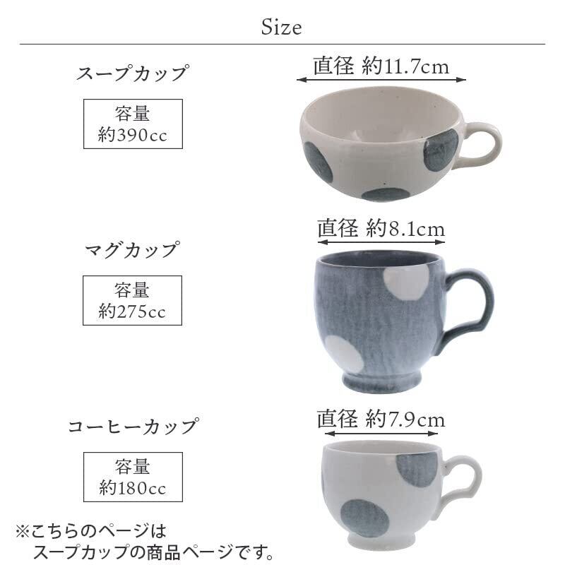 こちらはEAST table(イーストテーブル)(旧:テーブルウェアイースト)のオリジナル商品です。素朴な水玉模様が心をほっと和ませてくれる、温かみのあるかわいいスープカップです。スープ以外にもサラダボウル、デザートボウルなど様々な用途で使いやすいサイズ。素材も耐久性に優れ、汚れが付きにくいストーンウェアで扱いやすく、普段使いにもおすすめ。サイズ/直径11.7×14.3(持ち手含む)×高さ6.5cm(商品により誤差があります) 重さ/約239g(商品により誤差があります) 容量/約390cc 素材/せっ器(ストーンウェア) 質感/つややか 生産地/日本(美濃焼) 電子レンジ・食洗機可 オーブン・直火不可 ※サイズは全て外寸になります。※色むらがある場合がございます。※ピンホール(針で突いたような小さな穴)が見られる場合がございます。※ボロがある場合がございます。※鉄粉(茶色い点・黒い点)が見られます。※釉薬の垂れや溜まりが見られる場合がございます。※手描きのため柄に個体差が見られます。※お客様のお使いのモニター設定、お部屋の照明等により実際の商品と色味が異なって見える場合がございます。※画像に含まれる小物は使用イメージのために使用しています。※不明な点がございましたら、お気軽にお問い合わせ下さい。