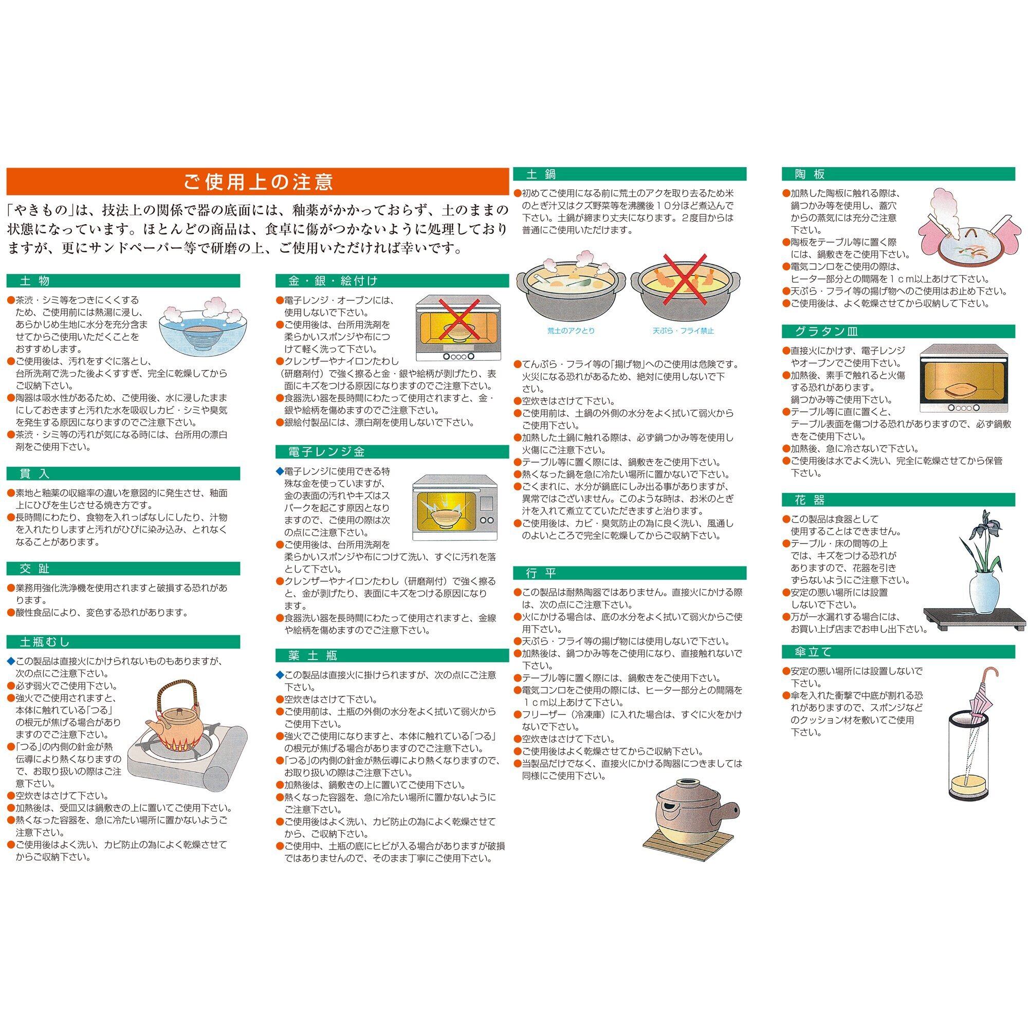 ●陶器は磁器と違い吸水性がありますので、ご使用後は十分に乾燥させてから収納してください。乾燥が不十分ですと、カビや臭いの原因となります。●土ものはご使用前にお湯に浸して生地に水を含ませておくと茶渋やシミが付きにくくなります。