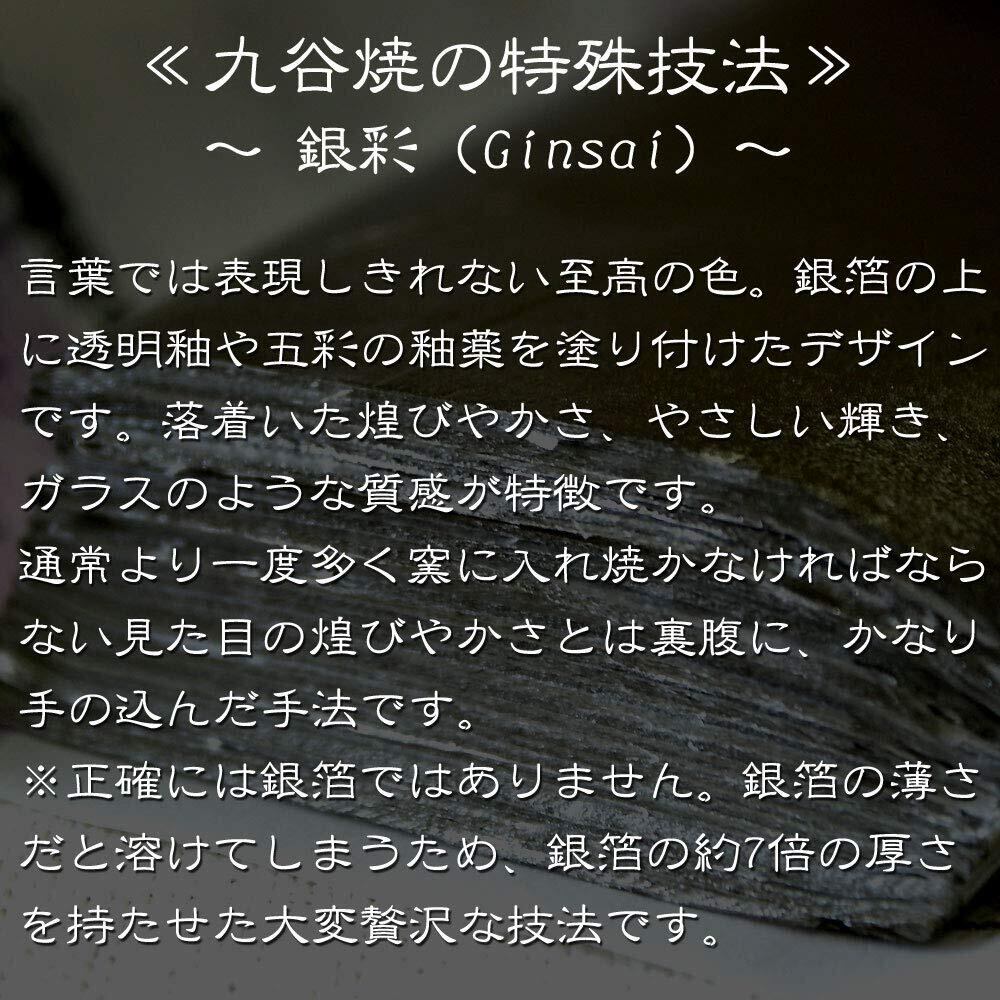 九谷焼の技法紹介:銀彩(Ginsai)言葉では表現しきれない至高の色。銀箔の上に透明釉や五彩の釉薬を塗り付けたデザインです。落着いた煌びやかさ、やさしい輝き、ガラスのような質感が特徴です。通常より一度多く窯に入れ焼かなければならない見た目の煌びやかさとは裏腹に、かなり手の込んだ手法です。※正確には銀箔ではありません。銀箔の薄さだと溶けてしまうため、銀箔の約7倍の厚さを持たせた大変贅沢な技法です。