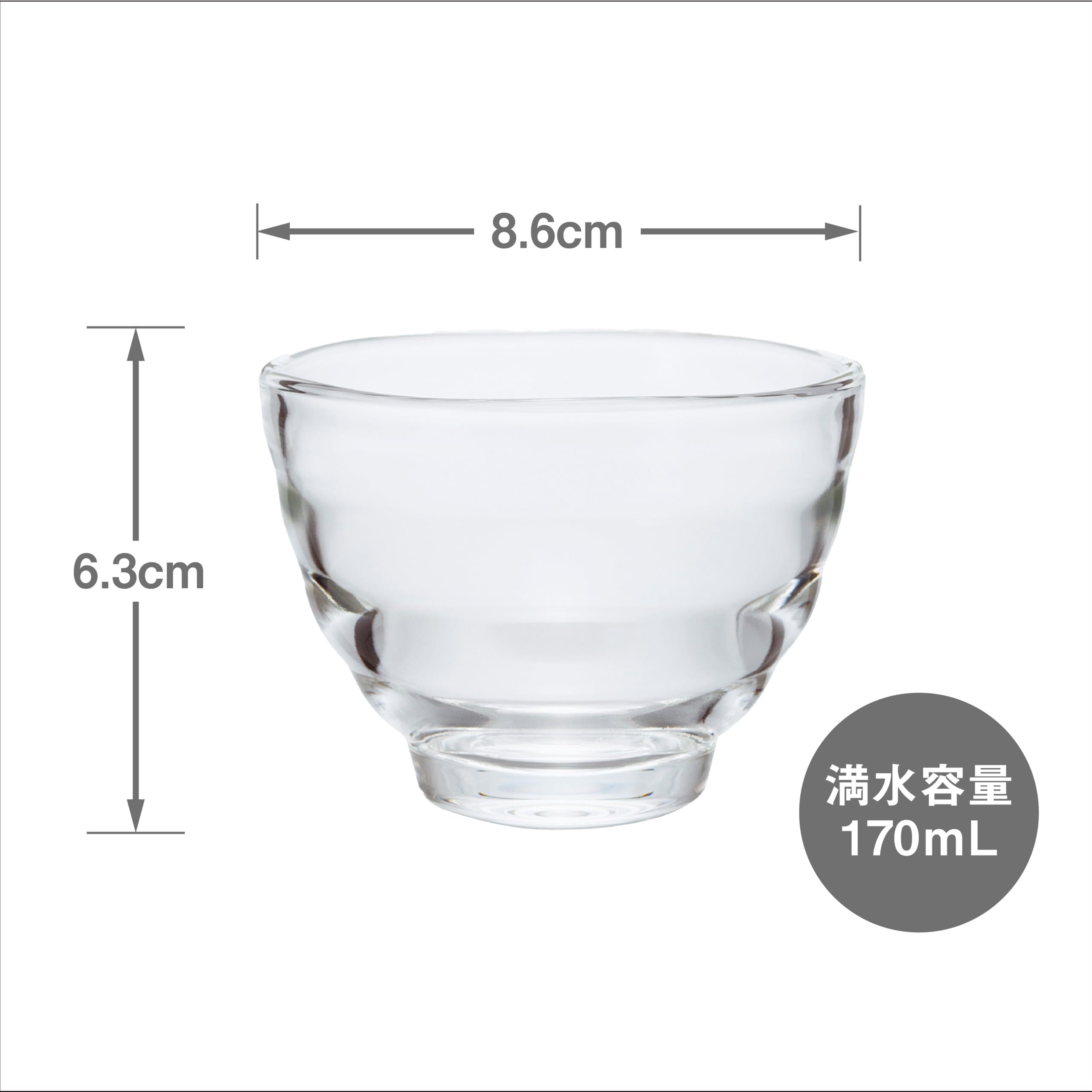 【商品詳細】本体サイズ:幅8.6×奥行8.6×高さ6.3cm、本体重量:約130g、満水容量170mL、本体材質:耐熱ガラス、日本製
