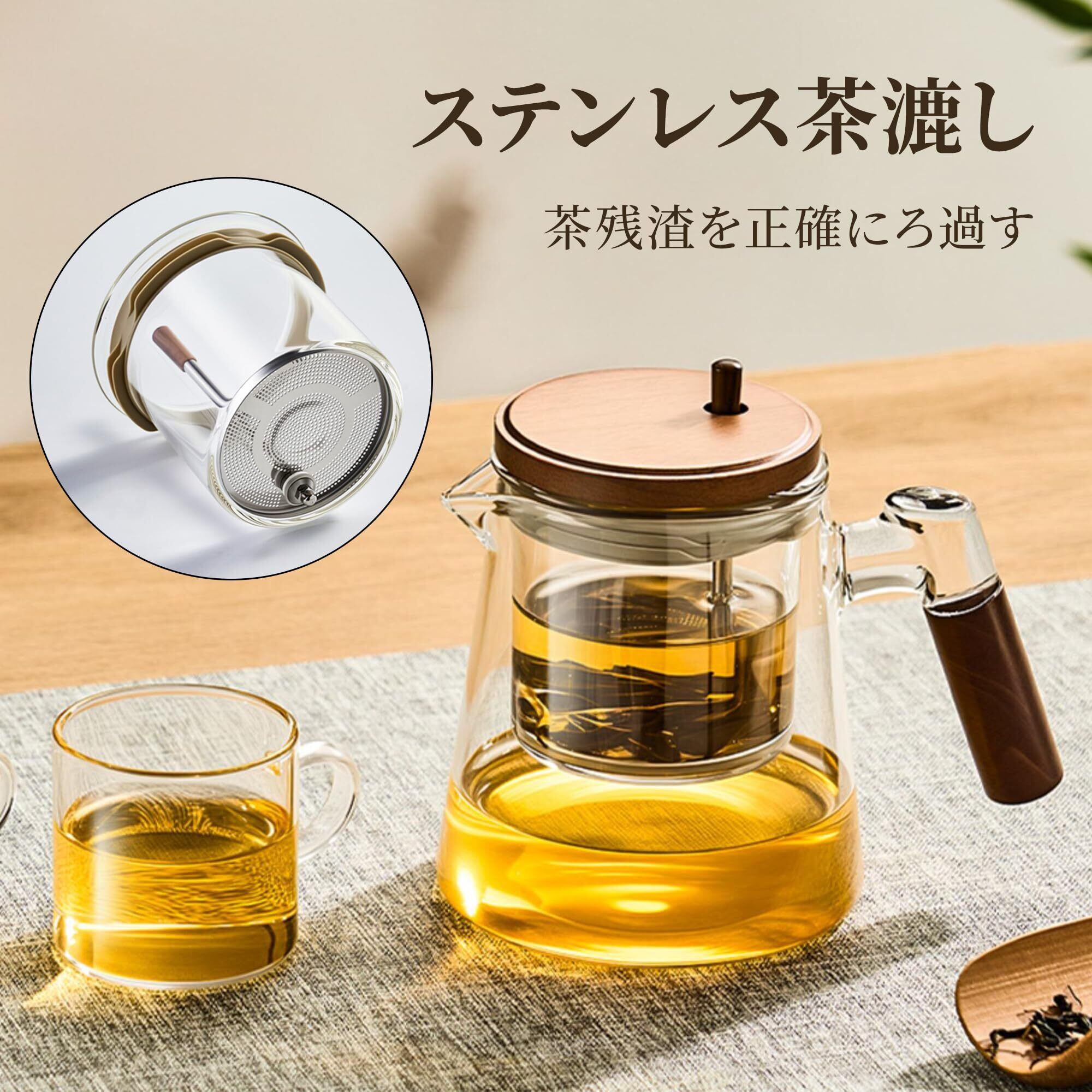GIANXI ジャンシ ティーカップ ワンタッチ 耐熱ガラス 茶こし付き ティーマグ 木製蓋付 取手付き おしゃれ 650ML 直火対応 紅茶 緑茶 フルーツティー リーフティー