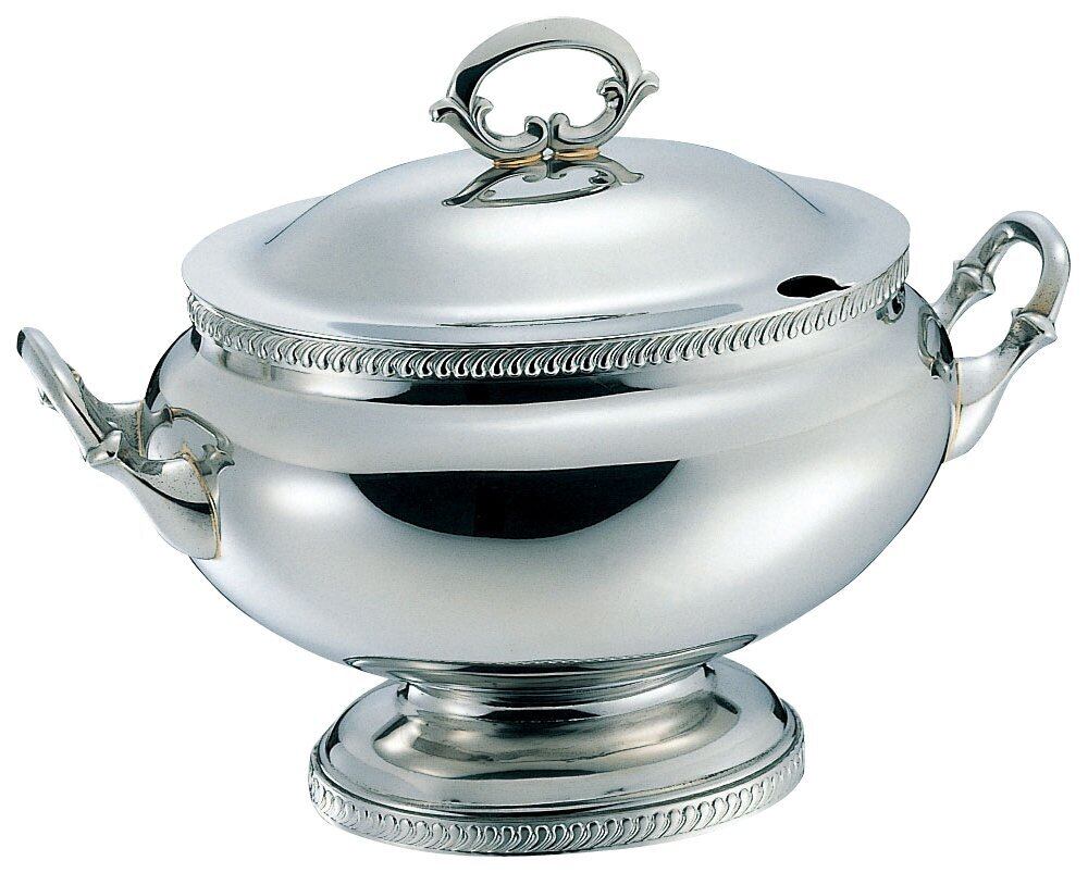 ホテルやレストランで使用するスープを入れる専門の容器。お客様の目の前でスープを取り分ける時に使います。華やかな飾りのある物は、ビュッフェテーブルに飾りとして置いても映えます。