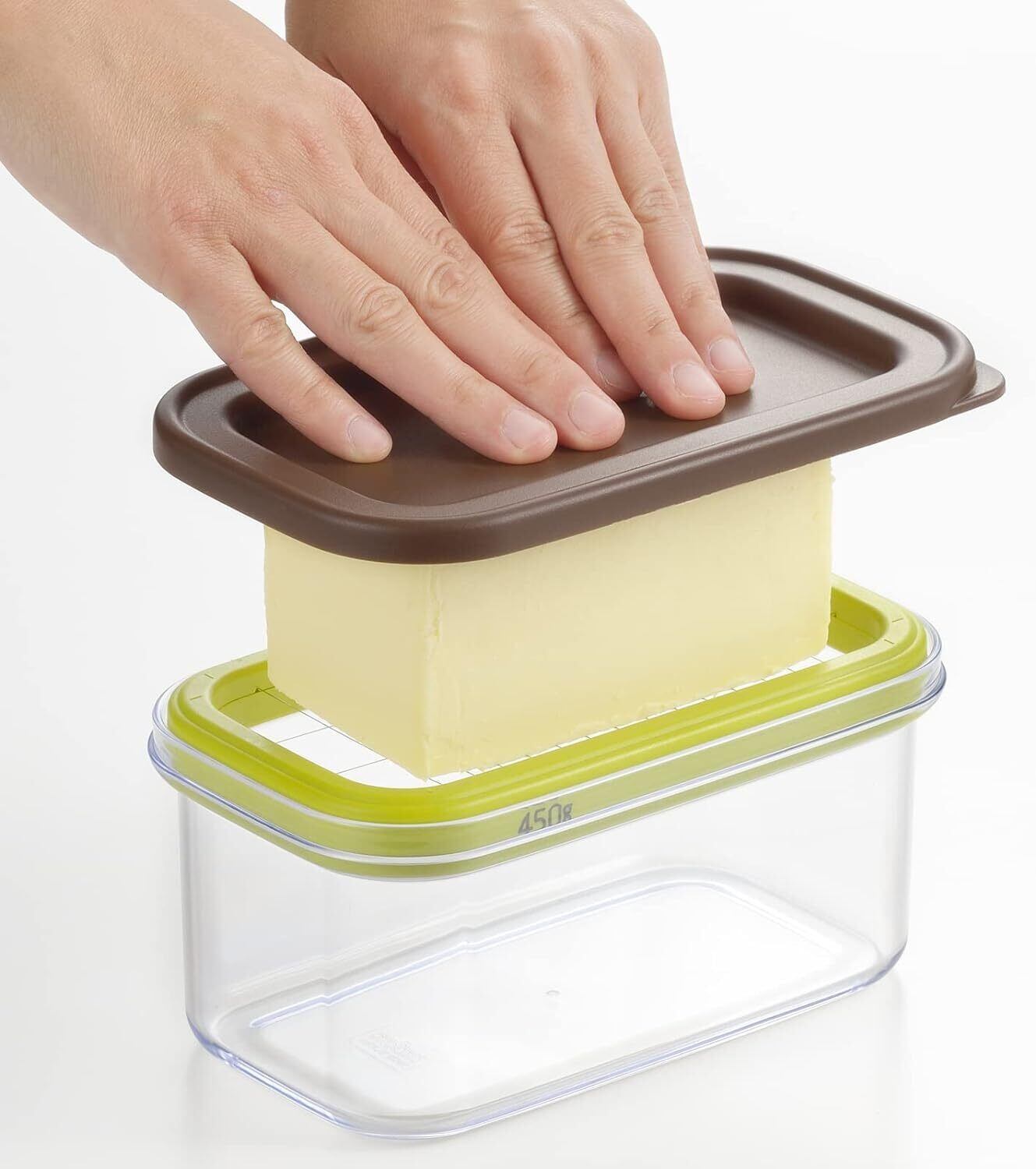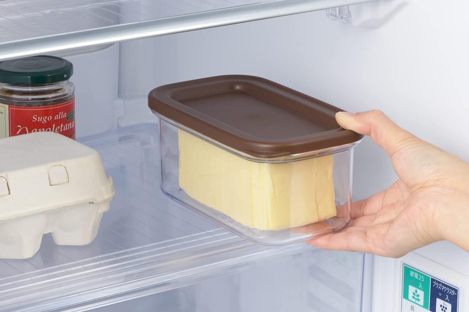 常温に戻したバターを、フタでギュッ~と押すだけでバターをカット。200gの家庭用バターはもちろん、450gの大容量ポンドバターにも使えるので、お料理や用途に応じて使い分けできる。ピタッと閉まるフタで、冷蔵庫内でストックしても乾燥しにくい。