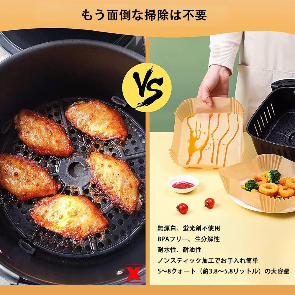 【使いやすい設計】エアフライヤーペーパーの内側は角形のボウルデザインで、裂けたり折りたたんだりすることなく、調理の準備ができたら直接入れることができます。周囲が高く、飛び散りを防ぎます。
