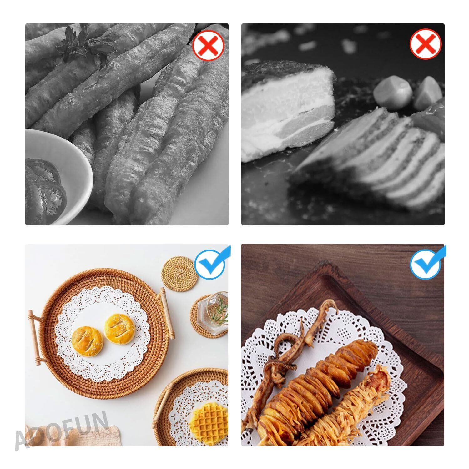 【無蛍光素材製】このレースペーパーは蛍光塗料などを使用せず無漂白パルプ配合の安心・安全です!あなたのケーキ、デザート、焼き、バーベキュー、揚げ物のニーズに応えることができます。