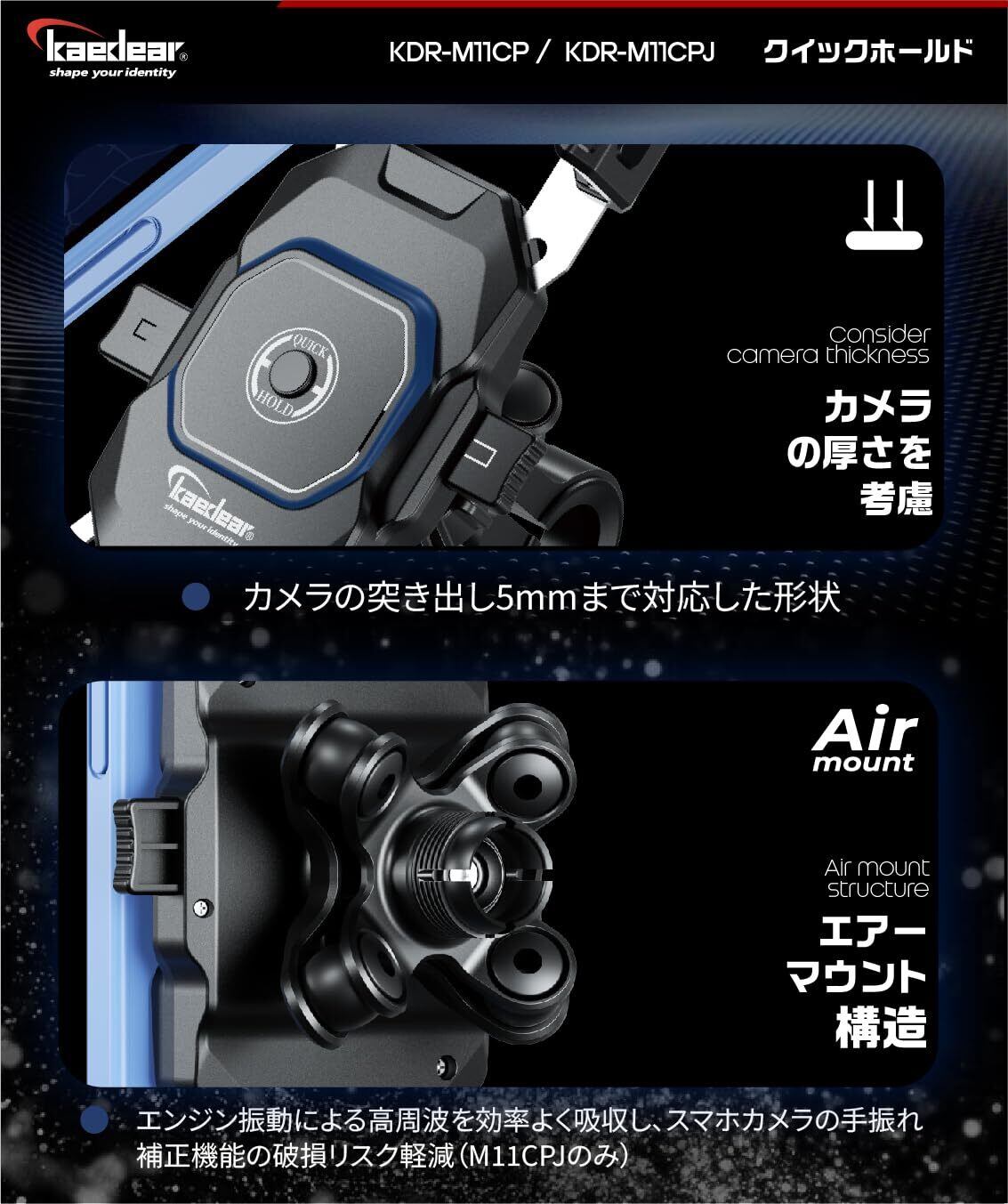 Kaedear(カエディア) バイク スマホホルダー バイク用スマホホルダー 携帯ホルダー 振動吸収 マウント 付属 スマホ スタンド アルミ製 マウント ハンドル ミラー 原付 オートバイ 自転車 / スマホ厚さ15mmまで, 縦長スマホ, カメラ突き出し,対応/アームロック機構, クイックホールドⅡ/Airアブソーバー KDR-M11CPJ-BK