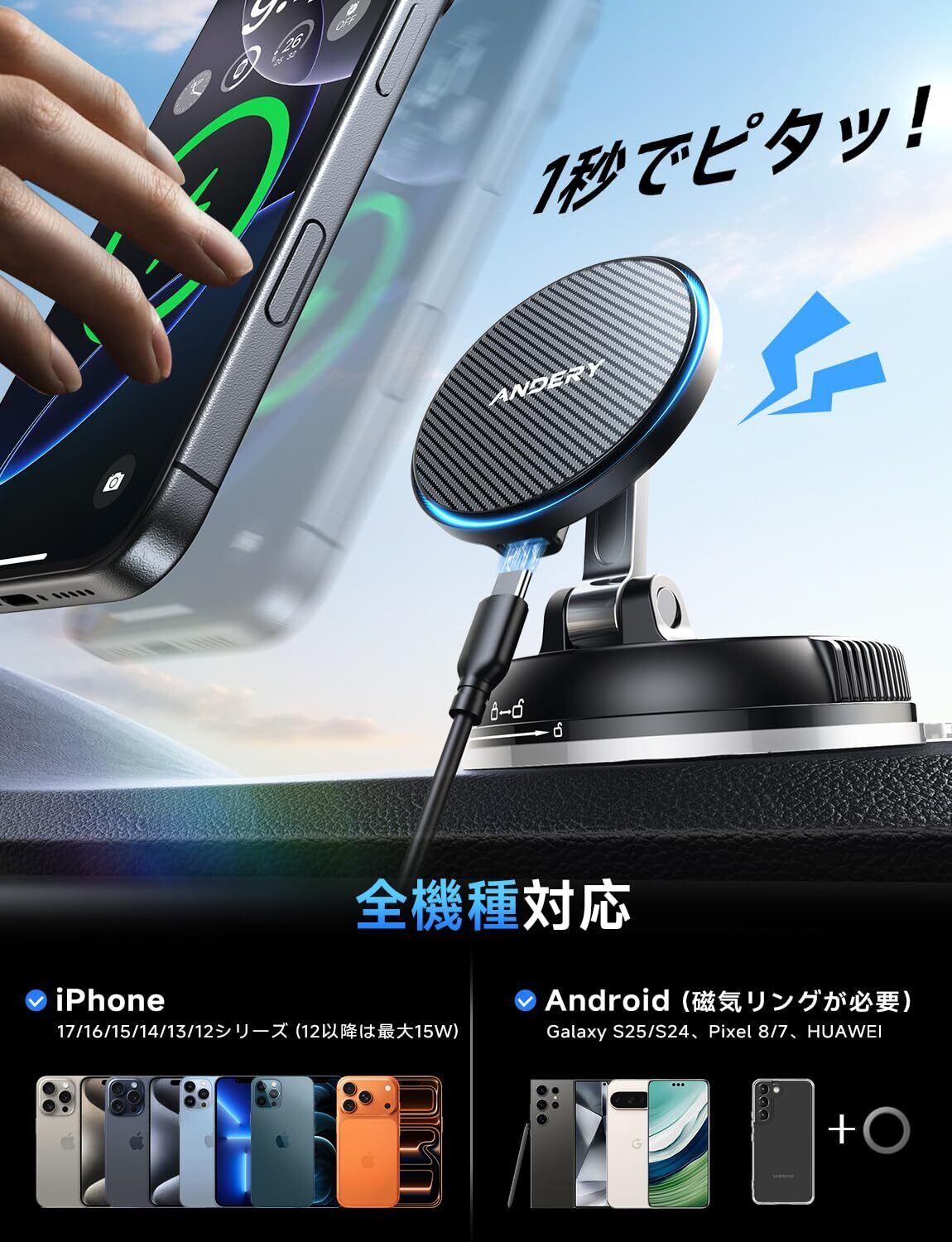 【最高品質、信頼の一品】ANDERYの車 スマホホルダーは、安価なプラスチック製品とは異なり、航空アルミ合金素材を採用した軸体で、9999回以上の折り曲げテストをクリア。スムーズな調整と高い耐久性を兼ね備えています。マグネット吸着部には職人技による繊細な表面加工を施し、ブルーLEDライト、確かな実用性と洗練された高級感を両立。父の日のプレゼントにもおすすめです!吸盤直径:7.2cm ケースの背面にマグネットリングを固定し、6時間放置して確実に接着してからご使用ください。ANDERYは年中無休、24時間対応のサポート体制を完備し、いつでもお客様をサポートいたします。 お客様の満足がの最優先事項です。信頼の品質をぜひ体感してください!