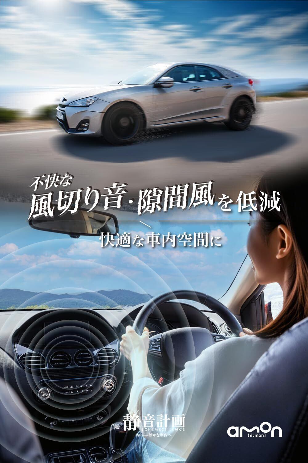 フロントとリアドア間の風切り音を低減 ・フロントとリアドア間のすき間を埋めて風の侵入を抑える ・ドアエッジに挟むだけカンタン ・特別な工具を必要とせず、ハサミだけで施工可能。