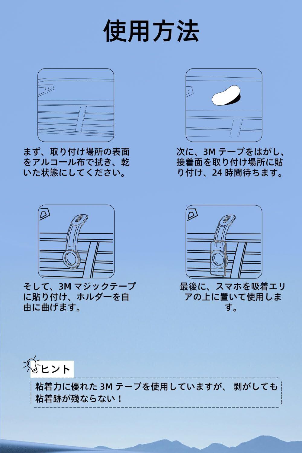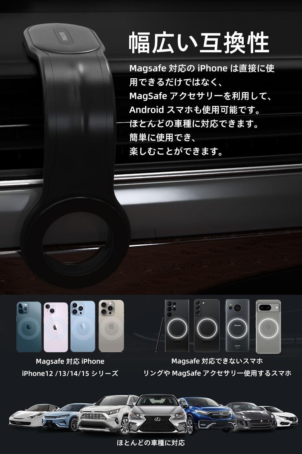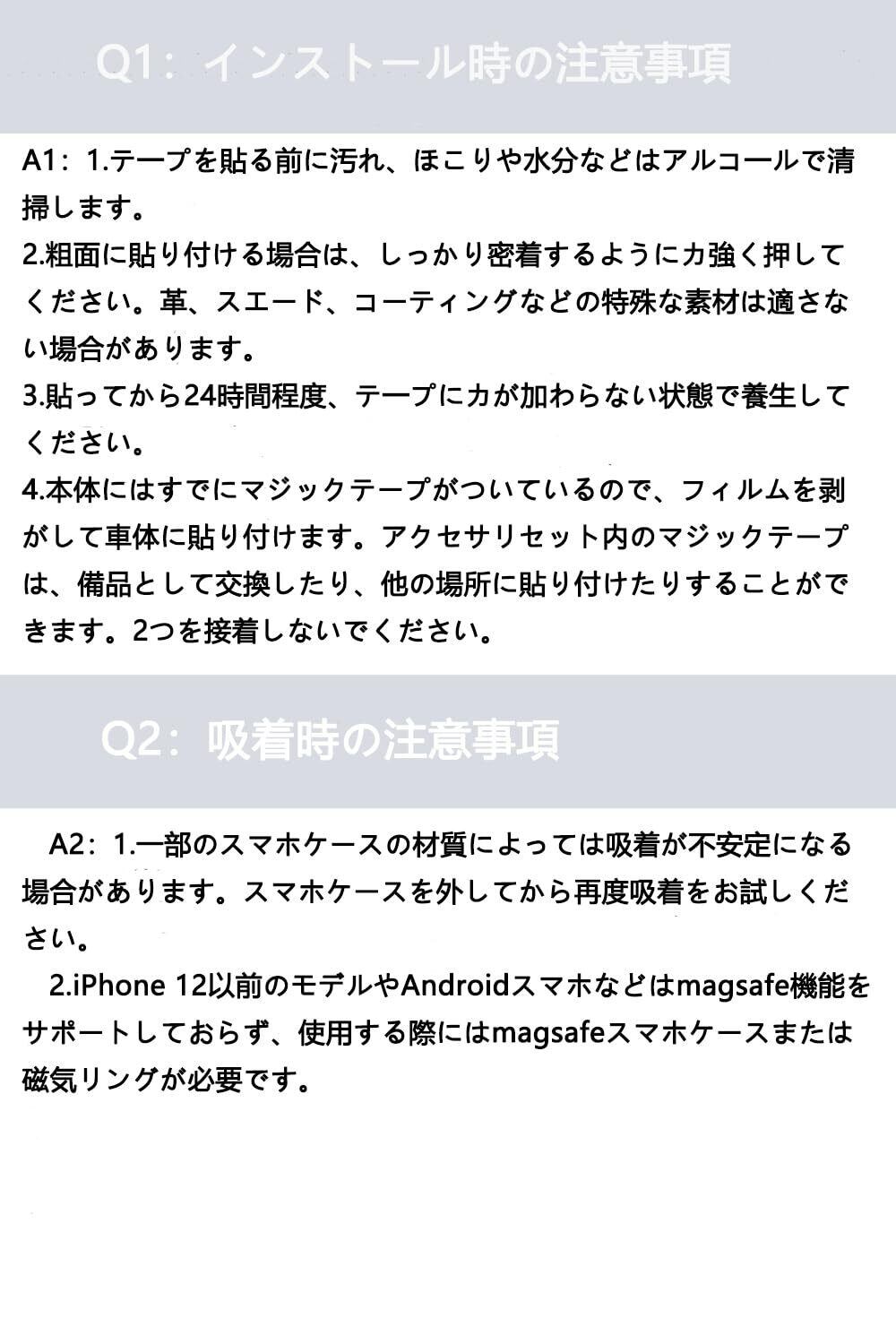 幅広い互換性:テープを使用するため、車内のダッシュボードやモニターなど平らな表面に取り付けることができます。運転の習慣により適合な位置を選んできます。また、Magsafe対応のスマホ(iPhone 12シリーズ以降)はホルダーを置くで直接に吸着可能だけではなく、付属のメタルプレ一トまたはMagsafeアクセサリ一を利用して、Magsafe機能ないのAndroidスマホも使用可能です。※Magsafeスマホケースを使用した場合は付属のメタルプレ一トを使用しないでください。