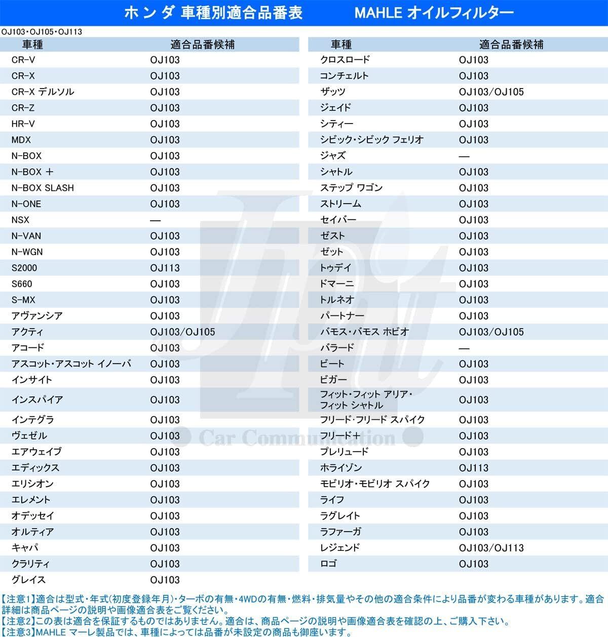 【2個セット】マーレ オイルフィルター オイルエレメント ホンダ CR-V CR-Z CR-X HR-V N-BOX N-ONE N-VAN N-WGN S660 S-MX ZR-V アクティ アコード インサイト インテグラ ヴェゼル オデッセイ シビック シャトル ステップワゴン トゥデイ バモス フィット シャトル モビリオ ライフ用 OJ103 15400-RTA-003