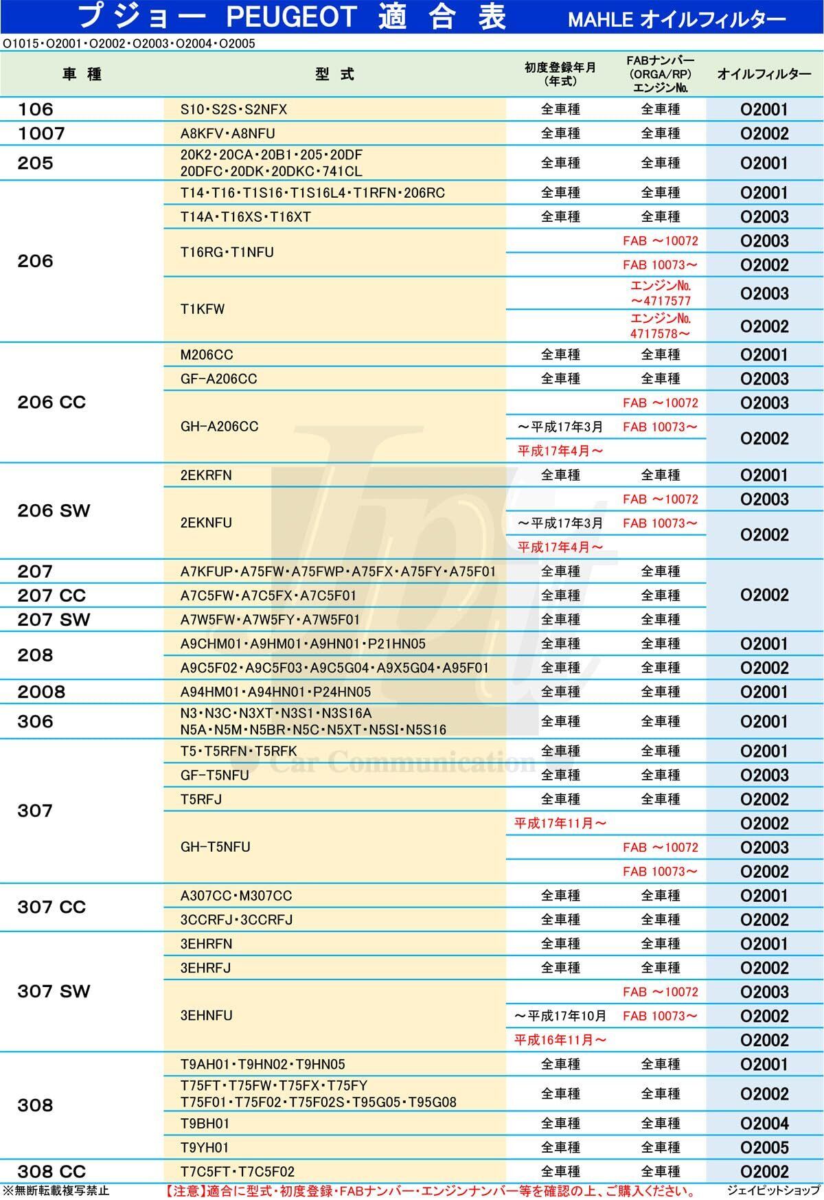 マーレ オイルフィルター オイルエレメント プジョー 106 205 206 208 2008 306 307 308 3008 307CC 307SW 206CC 206SW 309 405 406 407 508 5008 605 607 MAHLE O2001