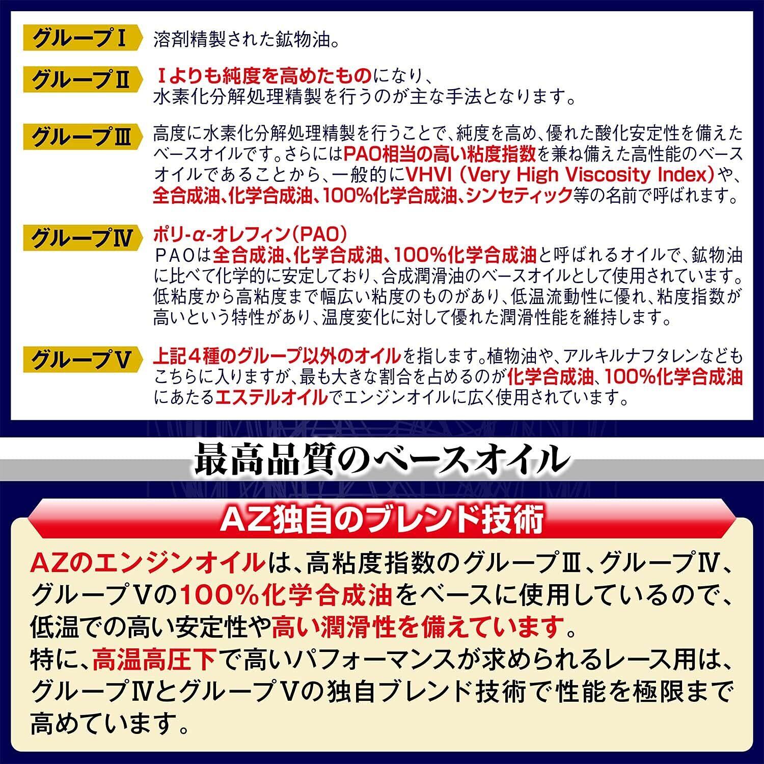 AZのエンジンオイルには、エステルオイルの特性を活かし、最高のパフォーマンスを発揮できるように配合設計するAZ独自の添加剤配合技術を用いています。