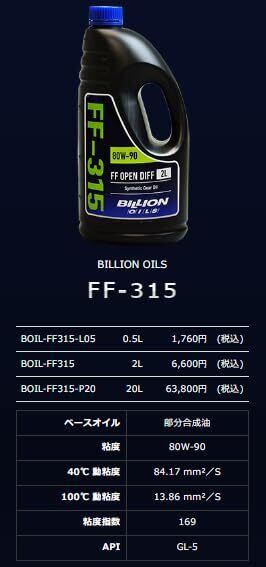 BILLION(ビリオン) OILS FFミッションオイル OPENデフ用 80W-90 2L BOIL-FF315