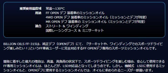 BILLION OILS FF-315は、純正デフ(OPENデフ)にて、「サーキットや、ワインディングでのスポーツドライビング楽しみたい!」というFF車両ユーザーに完全対応するFF OPENデフ専用のスポーツミッションオイルです。開発に着手した最大の理由は、高温、高負荷の状況下で、スポーツドライビングを楽しむ場合、安心して使用できるFF専用ミッションオイルは、ほとんどが、LSD対応品となってしまう点です。しかし、機械式 LSDに使用するミッションオイルと、OPENデフに使用するミッションオイルでは、オイルに求められるニーズが一部違います。まず、ギヤ/シンクロの保護およびシンクロの同期に関しては、機械式LSDおよび、OPENデフともに、極圧性・耐摩耗性に優れ、どんな状況でも強固な油膜を維持するミッションオイルが、必要不可欠となります。しかし、機械式LSDオイルの「キモ」となり、コストにも大きく影響している LSDディスク間の潤滑を行うために添加されている摩擦調整剤グループ2は、ディスクを持たない、OPENデフの構造には、必要ありません。そこで、BILLION OILS FF-315では、機械式LSDディスクに対応する高価な摩擦調整剤グループ2を排除し、OPENデフにとって、もっとも必要な ピニオンギヤ部の潤滑性能と、ミッション部のギヤおよびシンクロの保護へ徹底的に的を絞ったベースオイルおよび、添加剤構成としました。もちろん、温度が変化しても、粘度が大きく変化しない テクノロジーが注入されていますので、高温、高負荷のスポーツドライビングにおいても、そして、ミッションオイルの温度が低いエンジン始動直後の状況でも、引っかかりのない的確なシフトフィールを実現します。また、高温耐久性に優れており、劣化スピードも穏やかですので、一般的なミッションオイルと、同等以上のライフを確保しています。