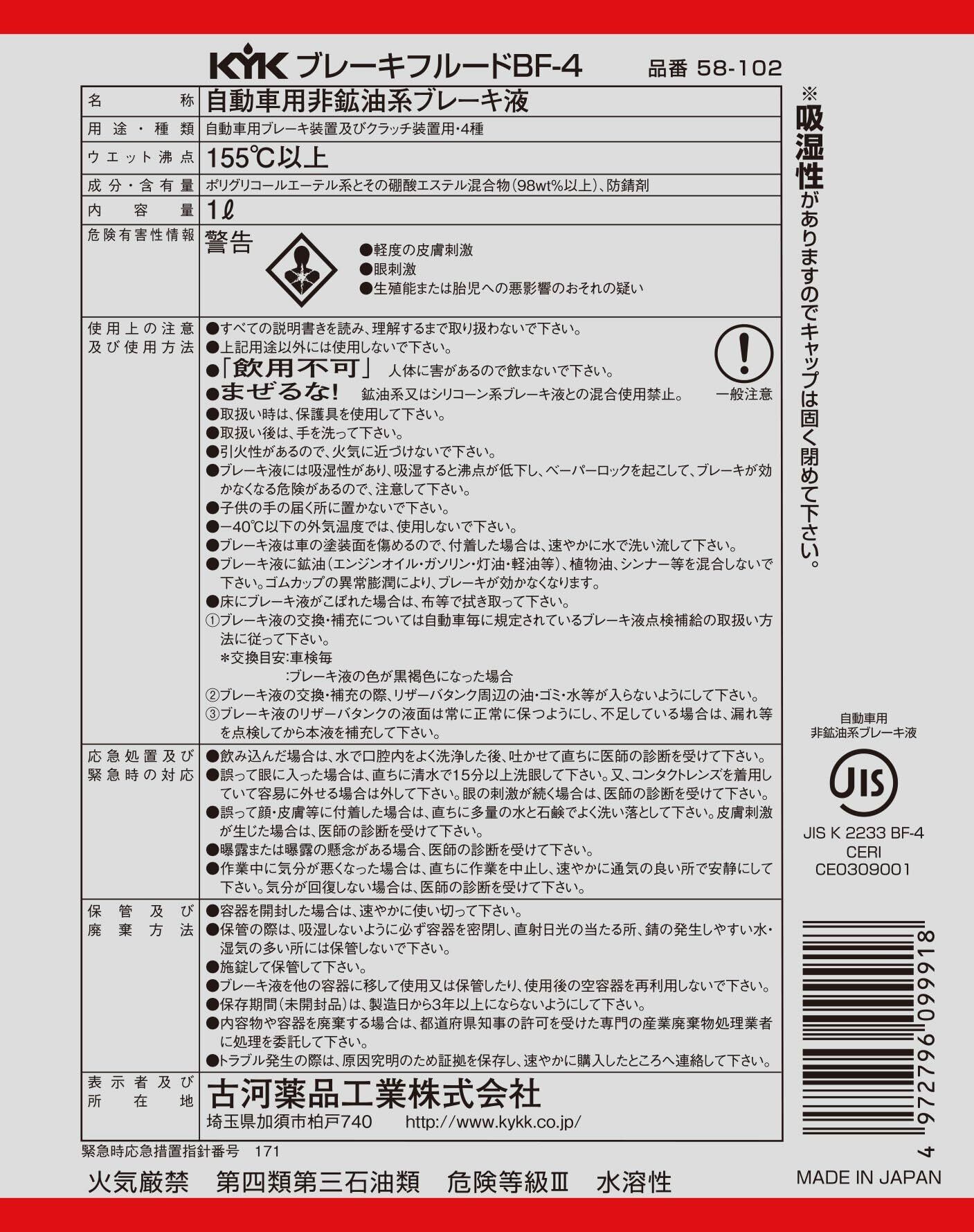 古河薬品工業(KYK) ブレーキフルード BF-4 1L 58-102