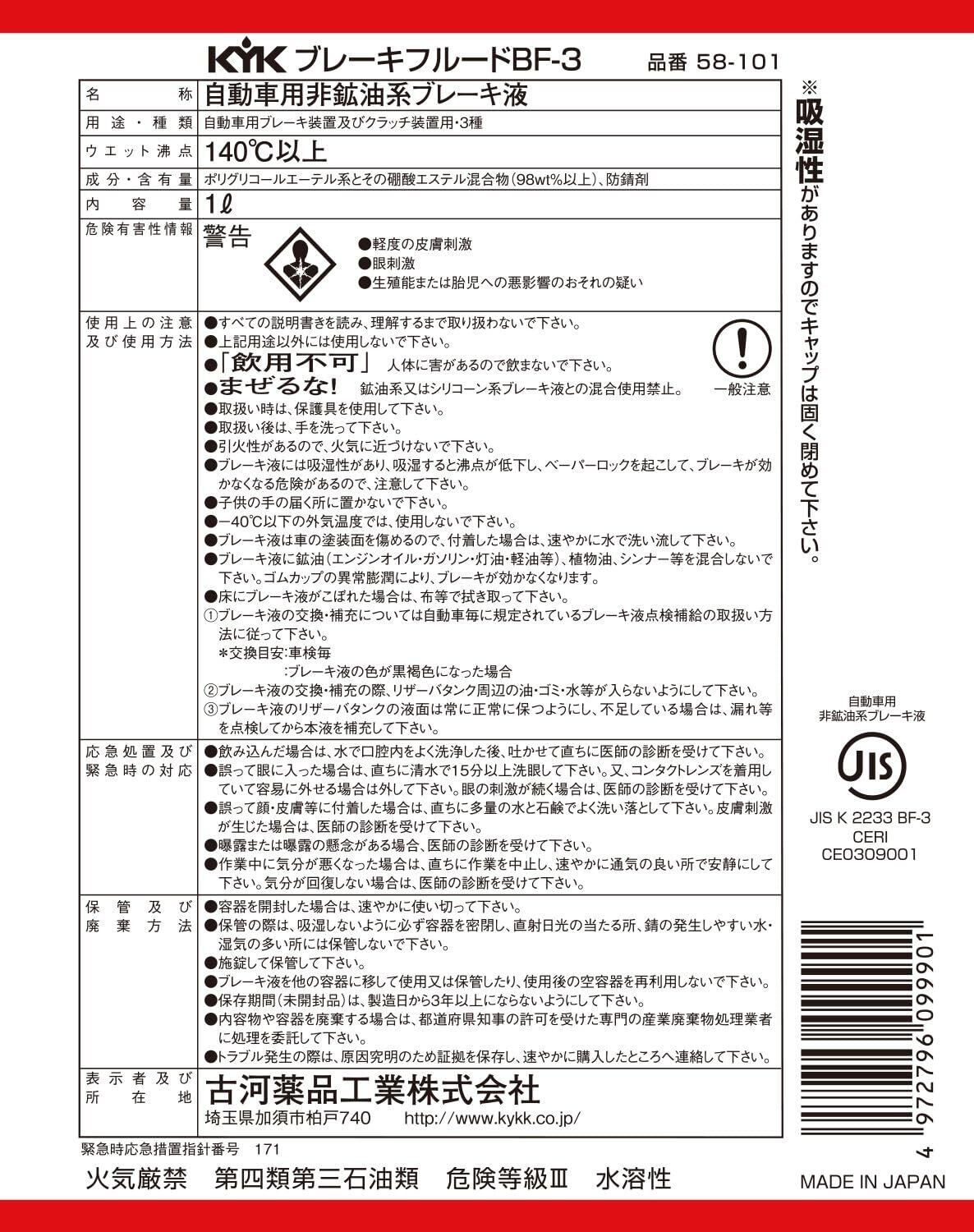 「古河薬品工業(KYK) ブレーキフルードBF-3」は、1Lの容量を持ち、優れた高沸点を実現したブレーキフルードです!厳しい走行条件下でも、ブレーキ性能を最大限に引き出し、愛車の安全をしっかりと支えます。