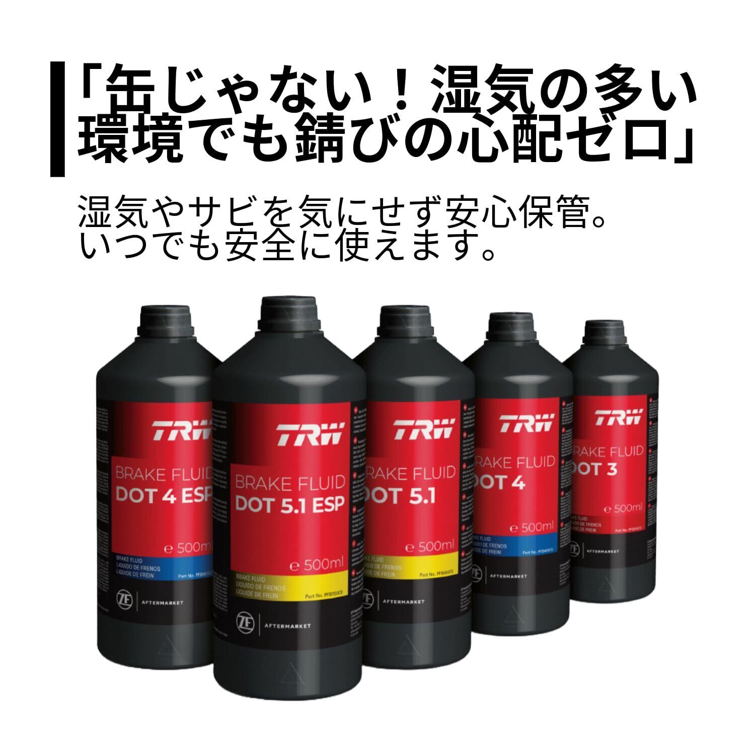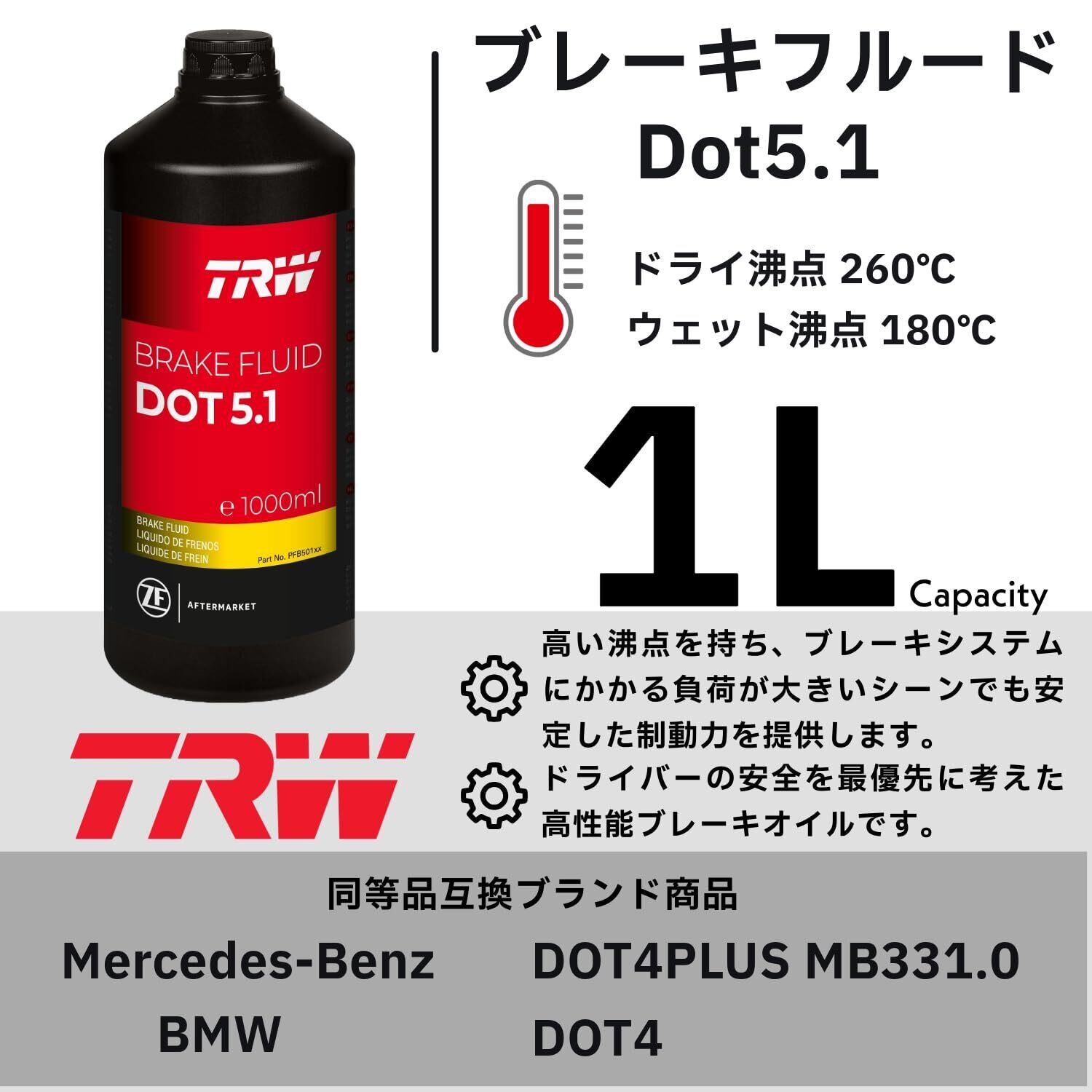 TRW ブレーキフルードDOT5.1は、ドライバーの安全を最優先に考えた⾼性能ブレーキオイルです。過酷な⾛⾏条件下でも安定した制動⼒を提供し、ブレーキシステムを常に最適な状態に保ちます。