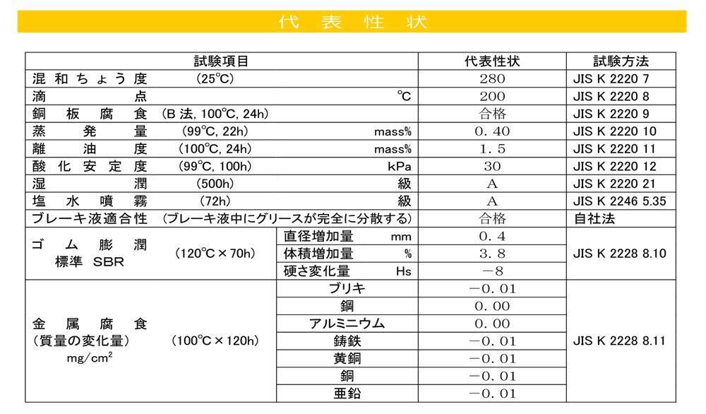 JIS K 2228 2 種(自動車ブレーキ用非鉱油系ラバー潤滑剤)に準拠し、各自動車メーカーで広く使用されています。