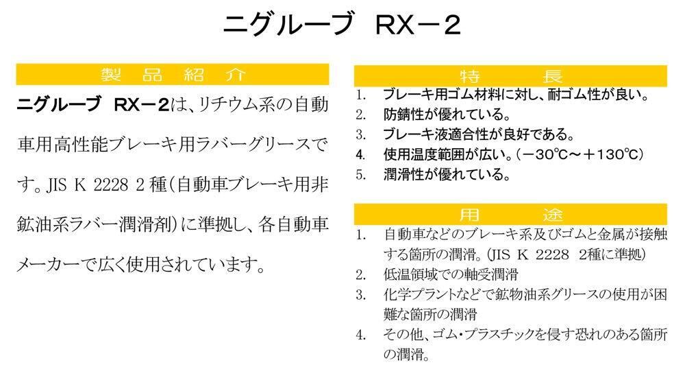 【製品紹介】ニグルーブ RX-2は、リチウム系自動車用高性能ブレーキ用ラバーグリースです。JIS K 2228 2種(自動車ブレーキ用非砿油系ラバー潤滑剤)準拠品。自動車メーカー7社で使用されている。